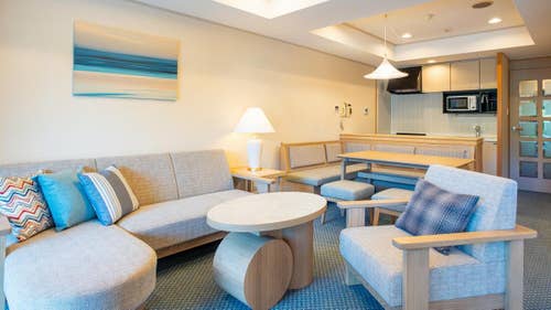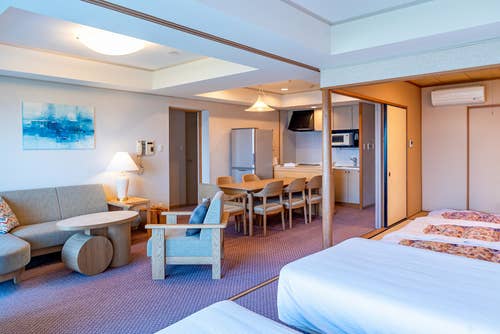 保持榻榻米的舒适感,在现代的设计和柔和的色调调和的客房里,度过悠闲的片刻时光。