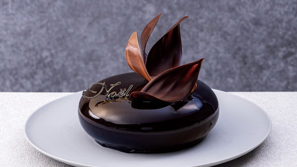 濃厚で香り高いカカオ80%のチョコレートムースの中に白ごまのブリュレを忍ばせ、艶やかなグラサージュショコラで包み込みました。カカオニブ入りのサブレを土台に、トップはチョコレートでアートのように美しく仕上げたノエルショコラです。