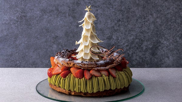 同じアイコニアグループの「ホテルエピナール那須」でも使用されている栃木県産いちご「とちあいか」をふんだんに使用し、香ばしいリング状のシュー生地にムスリーヌピスターシュとハイカカオクリームを重ねました。中央には、ホワイトチョコで作り上げた可憐なクリスマスツリーを飾り、特別な夜にふさわしい華やぎを添えます。