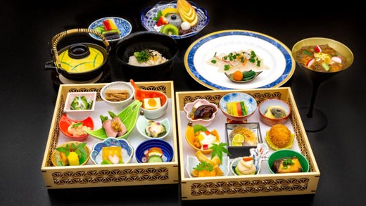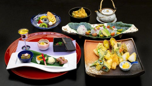 【开胃菜】 凉拌佐土原茄子/凉拌时令蔬菜等肉/盐曲腌渍烤县产鸡/目光紫苏卷炸/芝煮虾仁/粟麸田乐