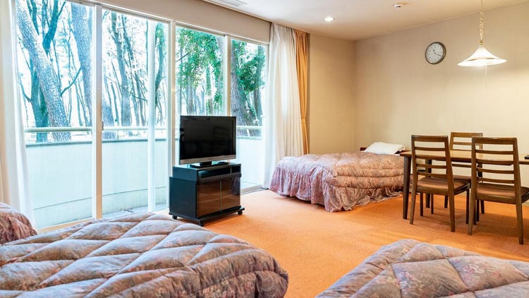 这是适合家庭或团体入住、可容纳4人的客房。也可将两间客房相互连通,最多可供8人使用。