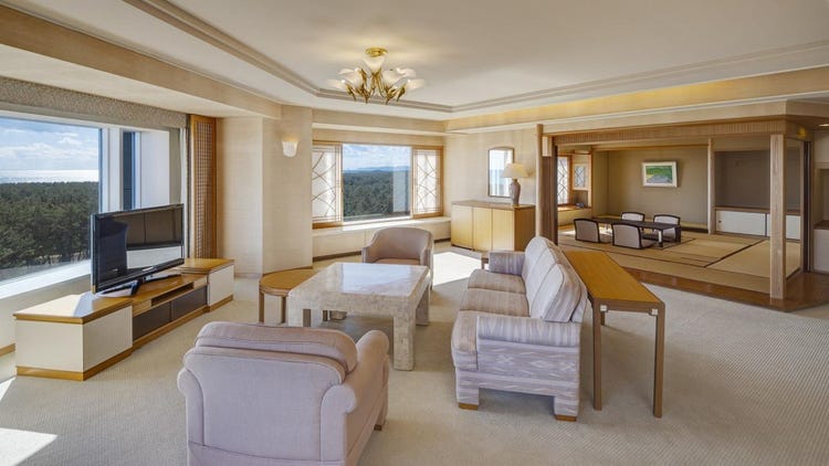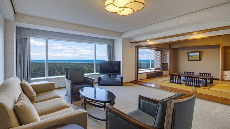 这是纯日式和室/和洋式的套房。配备10榻榻米的主和室、起居室以及双床卧室,总面积达176平方米,空间十分宽敞。