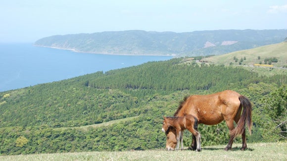 都井岬位于宫崎县的最南端,向太平洋突出,从江户时代起,在这里放牧饲养的“御崎马”已有约300年历史。是纯粹的日本在来马,被指定为国家天然纪念物。春天是生产季节,说不定会遇到可爱的春驹。