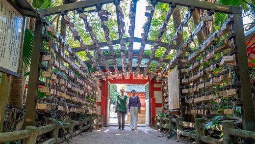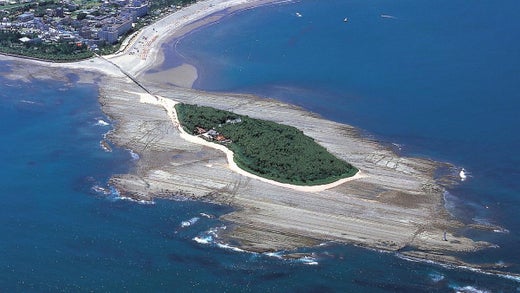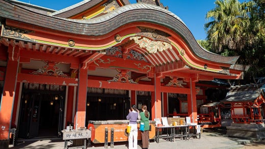青岛神社位于青岛,是一座充满南国风情的神社,以祈求结缘和恋爱成功而闻名。位于周围被称为“鬼的洗衣板”的独特岩石包围的岛上,涂成朱红色的神殿与蓝色的大海和天空相映成趣,是一处美丽的景点。