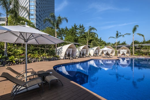“THE LIVING GARDEN ”是一个开阔的空间,让您体验海外度假胜地的氛围。这里还设有带白色沙滩的儿童泳池,即使是小孩子也能安全玩耍。全家人可以租用沙滩游乐设施,在蓝天白云下尽情玩耍,享受一整天的欢乐时光。